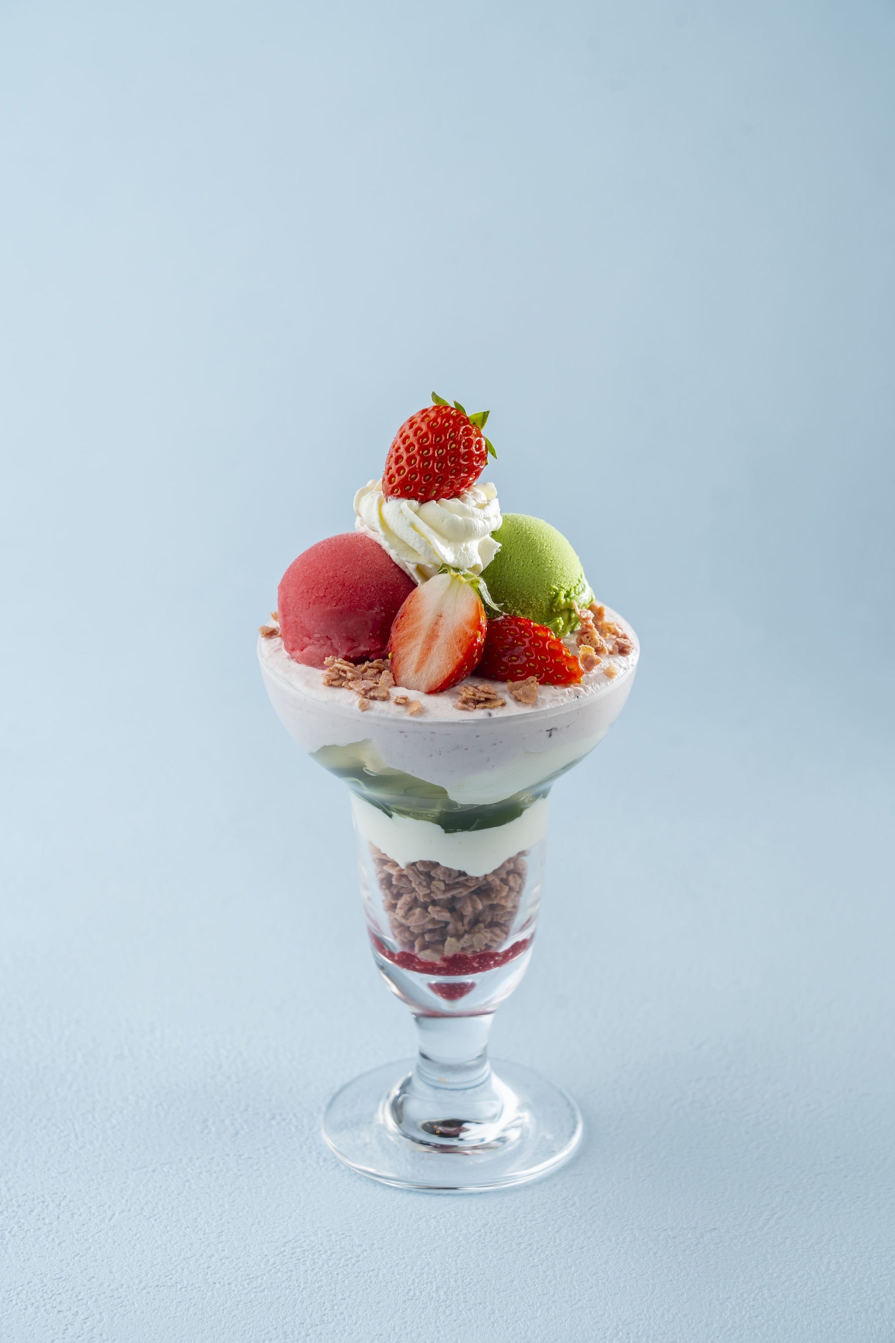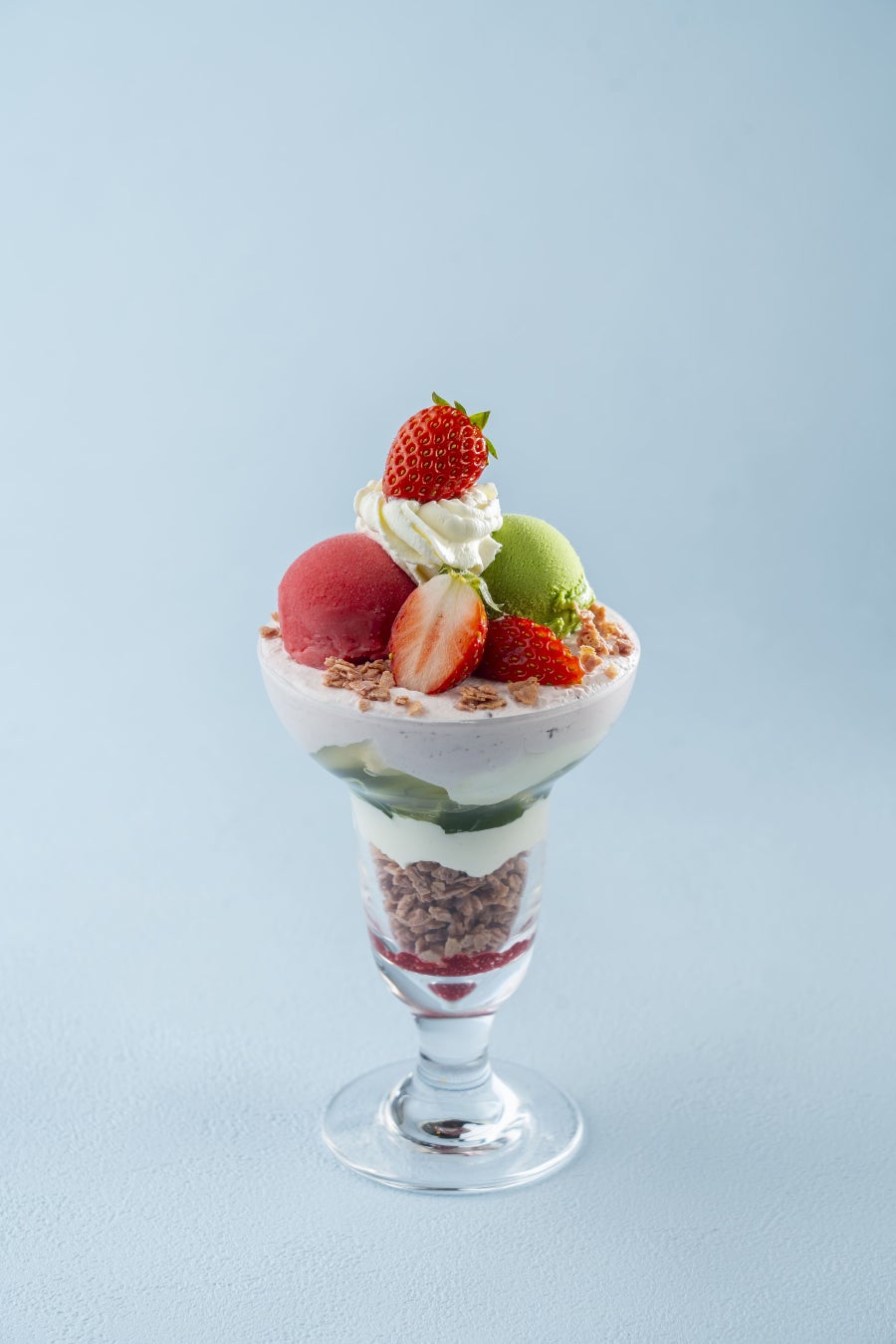 The berry mascarpone cream is made by mixing a rich and creamy mascarpone cheese with a berry sauce, which gives a refined sourness and richness. It is combined with Uji matcha ice cream, matcha sponge cake, and refreshing apple and rose tea jelly to create a refreshing aftertaste, like a soft sunlight shining on a spring field. The parfait will be available from April 1st
